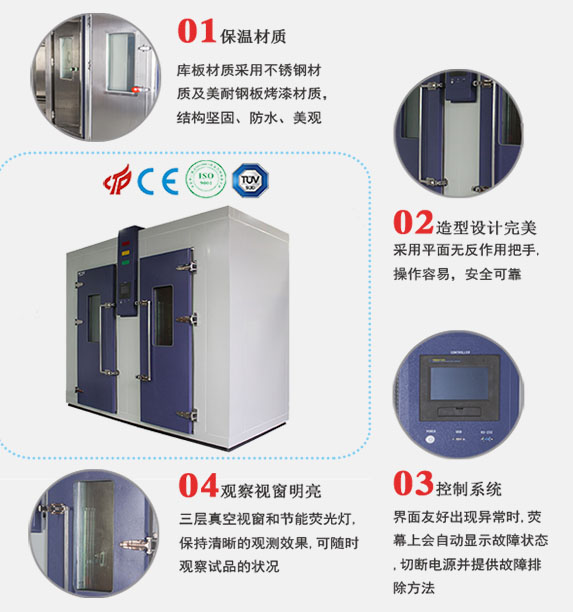 高溫高濕房適用于電子產品、信息電子儀器儀表、材料、電工、電子產品、各種電子元氣件在高低溫或濕熱環境下、檢驗其各性能項指標。產品主要由控制面版、配電盤、保濕庫板送風機、加熱器、加濕器、冷凍機組合而成。提供業界大型零件、半成品、成品、溫濕度環境測試,如:電腦終端機、汽車零件,還可根據用戶需求定制生產