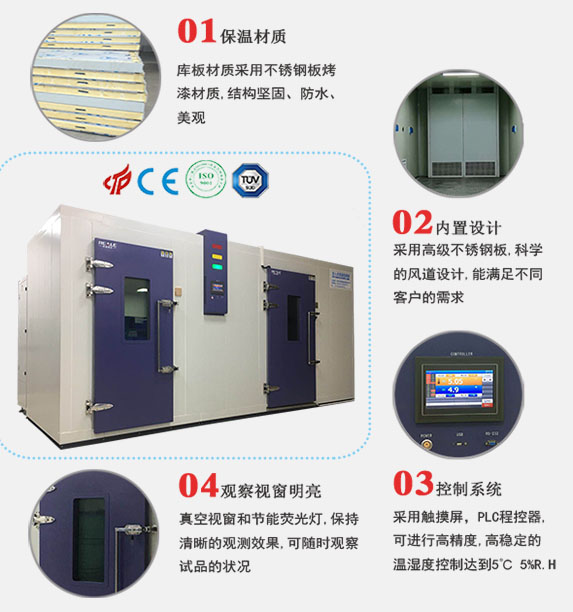 步入式高低溫交變濕熱試驗室適用于電工、電子、儀器儀表及其它產品、零部件鹽霧試驗箱及材料在高低溫交變濕熱環境下貯存、運輸、使用時的適應性試驗。環瑞測試提供用于測試和確定電工,電子及其它產品及材料在不同溫度,濕度條件下,其耐潮濕,耐干燥的能力及高溫,低溫環境下的存儲,運輸和使用的適應性試驗,還可根據用戶需求定制生產