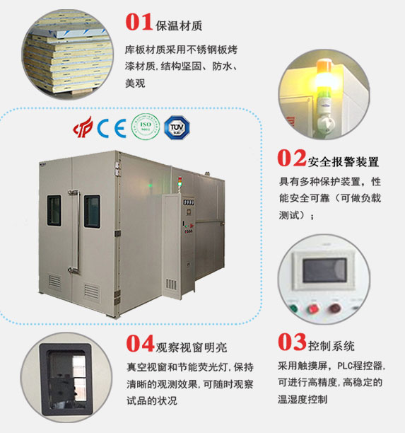 環境氣候試驗室為業界大型零件、半成品、成品的溫濕度環境測試,如:計算機終端機、汽車零部件。環境氣候試驗室主要由控制面板、配電盤、保濕庫板、送風機、加熱器、加濕器、冷凍機組合而成。環境氣候試驗室根據用戶要求并參照JB/T4283-91;GB/T14294-93設計、制造。主要用于制造和維持溫度與濕度恒定的空間,該恒溫恒濕裝置的制冷、加熱、除濕、加濕、補充加濕水等完全自動控制,該設備可以附加(選配)換氣功能,可以在內部有不良揮發氣體時允許人員長期在內部操作。還可根據用戶需求定制生產