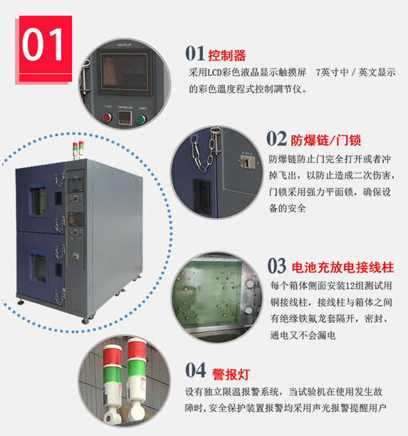 雙層防爆高低溫試驗箱采用單機雙箱體設計,上下各一個測試箱體,兩個箱體的控制系統及冷凍系統完全獨立運行。箱體的前面和后面泄壓門均加裝防爆鏈,當電池爆炸造成極大的沖擊力將設備門沖開時,防爆鏈起到緩沖作用,防止門完全打開或者沖掉飛出,以防止造成二次傷害,另外防爆門與箱體之間連接的合頁采用加強型304#不銹鋼,同時,門鎖采用強力平面鎖,確保設備的安全。每個箱體側面安裝12組測試用銅接線柱,接線柱與箱體之間有絕緣鐵氟龍?zhí)赘糸_,密封、通電又不會漏電