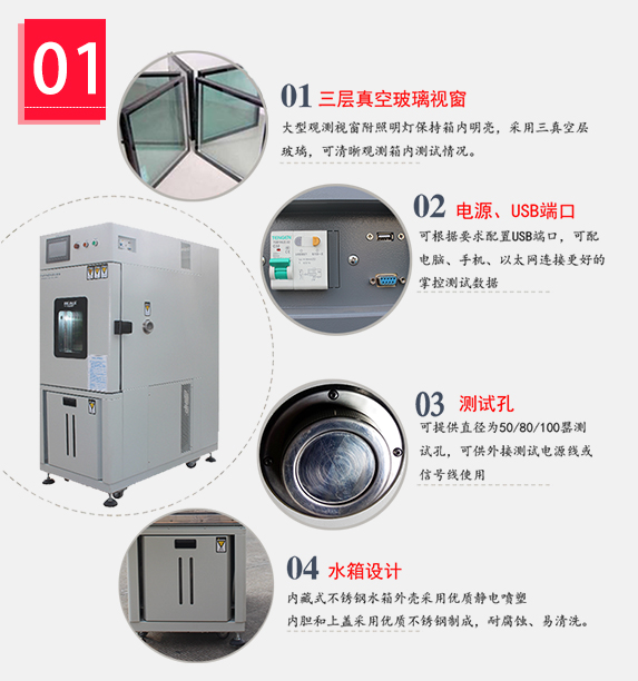| 標準配件Standard Accessories | 三層真空層觀察窗1個、Φ5cm測試孔一個、試驗架2套、箱內照明燈1個、指示燈、移動工作輪4個、水箱,電源線2米、通訊界面 one observation window , one test hole(Φ5cm),Two sets of test racks,one floodlight,one indicator light, four moving wheels,one humidifying tank,2 meters of power cord,communication interface |