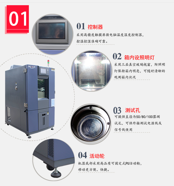 | 標準配件Standard Accessories | 三層真空層觀察窗1個、Φ5cm測試孔一個、試驗架2套、箱內照明燈1個、指示燈、移動工作輪4個、水箱,電源線2米、通訊界面 one observation window , one test hole(Φ5cm),Two sets of test racks,one floodlight,one indicator light, four moving wheels,one humidifying tank,2 meters of power cord,communication interface |