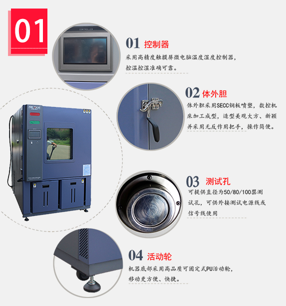 | 標(biāo)準(zhǔn)配件Standard Accessories | 三層真空層觀察窗1個、Φ5cm測試孔一個、試驗架2套、箱內(nèi)照明燈1個、指示燈、移動工作輪4個、水箱,電源線2米、通訊界面 one observation window , one test hole(Φ5cm),Two sets of test racks,one floodlight,one indicator light, four moving wheels,one humidifying tank,2 meters of power cord,communication interface |