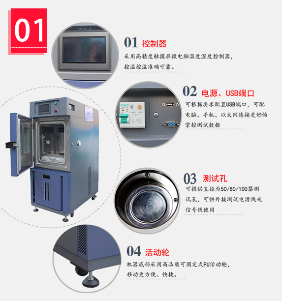 | 標準配件Standard Accessories | 三層真空層觀察窗1個、Φ5cm測試孔一個、試驗架2套、箱內照明燈1個、指示燈、移動工作輪4個、加濕水箱1個,電源線2米、通訊界面 one observation window , one test hole(Φ5cm),Two sets of test racks,one floodlight,one indicator light, four moving wheels,one humidifying tank,2 meters of power cord,communication interface |