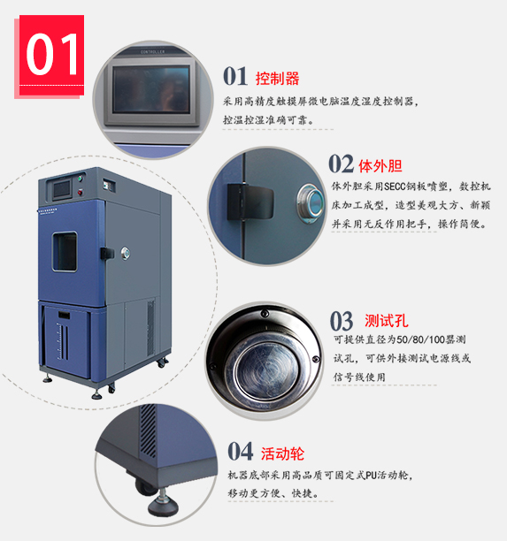 | 標(biāo)準(zhǔn)配件Standard Accessories | 三層真空層觀察窗1個(gè)、Φ5cm測試孔一個(gè)、試驗(yàn)架2套、箱內(nèi)照明燈1個(gè)、指示燈、移動(dòng)工作輪4個(gè)、加濕水箱1個(gè),電源線2米、通訊界面 one observation window , one test hole(Φ5cm),Two sets of test racks,one floodlight,one indicator light, four moving wheels,one humidifying tank,2 meters of power cord,communication interface |