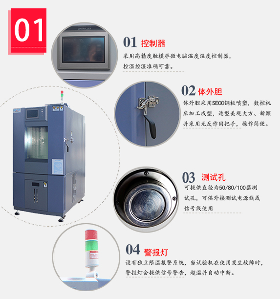 | 標準配件Standard Accessories | 三層真空層觀察窗1個、Φ5cm測試孔一個、試驗架2套、箱內照明燈1個、指示燈、移動工作輪4個、加濕水箱1個,電源線2米、通訊界面 one observation window , one test hole(Φ5cm),Two sets of test racks,one floodlight,one indicator light, four moving wheels,one humidifying tank,2 meters of power cord,communication interface |