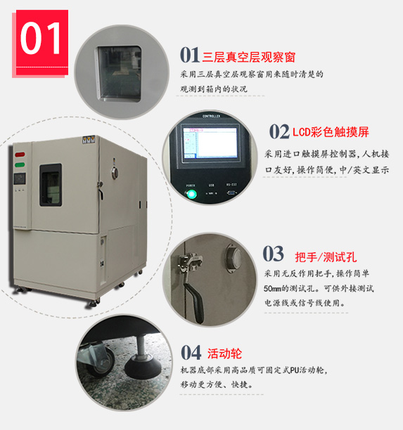 | 標(biāo)準(zhǔn)配件Standard Accessories | 28cm*34cm三層真空層觀察窗1個(gè)、Φ5cm測(cè)試孔一個(gè)、試驗(yàn)架2套、箱內(nèi)照明燈1個(gè)、指示燈、移動(dòng)工作輪4個(gè)、加濕水箱1個(gè),電源線2米、通訊界面 one observation window (28cm*34cm) , one test hole(Φ5cm),Two sets of test racks,one floodlight,one indicator light, four moving wheels,one humidifying tank,2 meters of power cord,communication interface |