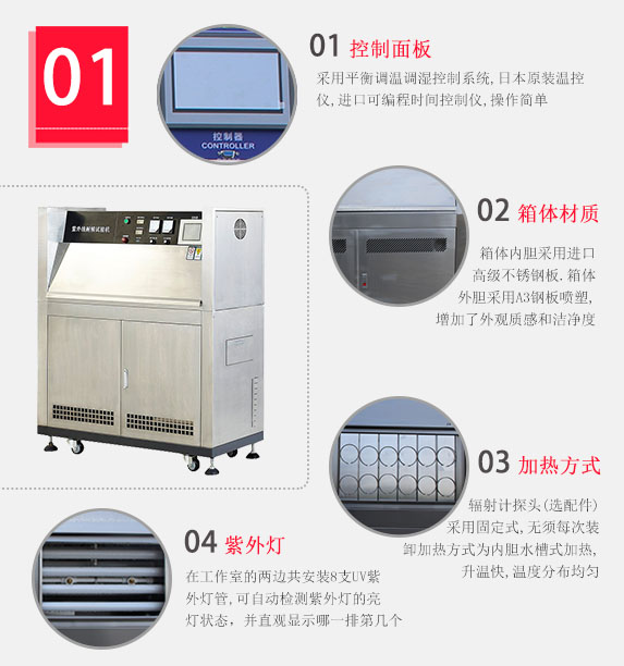 燈管采用美國進口Q-Lab或美國ATlas(亞太拉斯)UVA340,UVB313燈管,原則上UVB-313的老化加速效果比UVA-340更快更明顯
