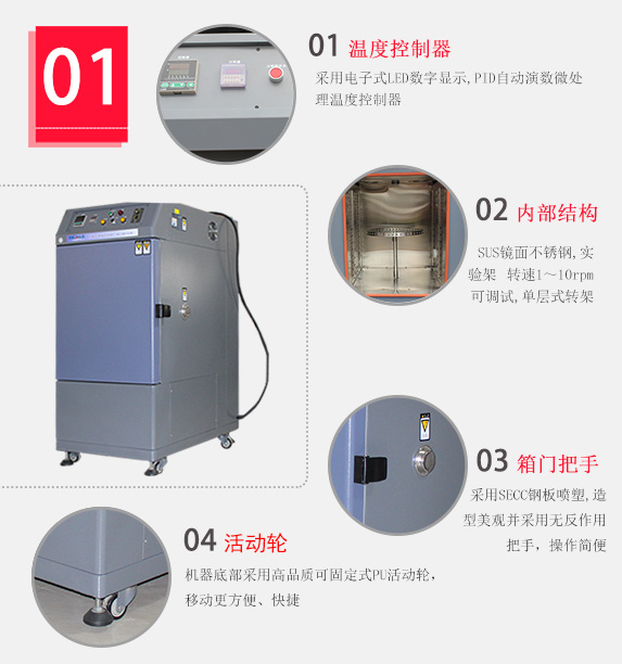 耐黃變試驗(yàn)箱作用為仿真陽光的紫外線輻射及熱度, 試樣于機(jī)臺內(nèi)經(jīng)紫外線照射與溫度作用, 經(jīng)過一段時(shí)間后,觀察試樣耐黃變的程度(一般認(rèn)為70℃時(shí)材料在箱體內(nèi)試驗(yàn)3小時(shí)相當(dāng)于自然環(huán)境中2個(gè)月黃變效果)可用染污灰色標(biāo)作參考, 判定其黃變的等級.產(chǎn)品在使用過程中受陽光輻射或運(yùn)輸過程中,貨柜環(huán)境之影響所發(fā)生顏色之改變造成產(chǎn)品的所瑕疵.使用300W之UV燈泡,使實(shí)驗(yàn)?zāi)軌蛟谳^短時(shí)間完成,可作為基本的耐黃變試驗(yàn),亦可當(dāng)老化試驗(yàn)機(jī)及烘箱使用, 呈現(xiàn)一機(jī)多用途的功能.