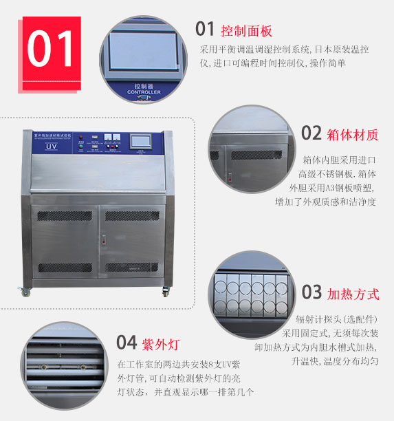 燈管采用美國進口Q-Lab或美國ATlas(亞太拉斯)UVA340,UVB313燈管,原則上UVB-313的老化加速效果比UVA-340更快更明顯