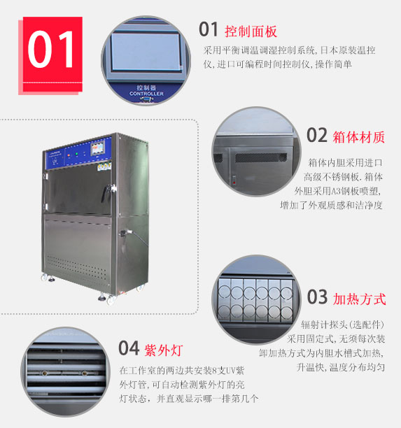 燈管采用美國進口Q-Lab或美國ATlas(亞太拉斯)UVA340,UVB313燈管,原則上UVB-313的老化加速效果比UVA-340更快更明顯