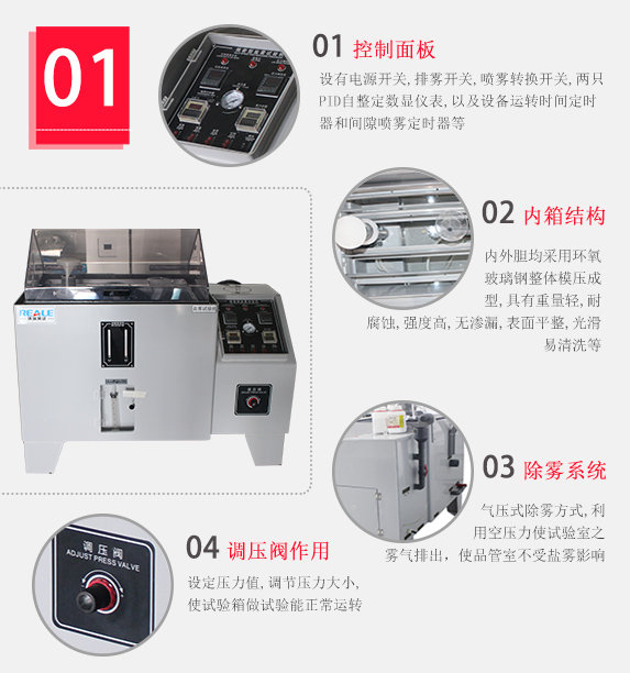 水密封形式使鹽霧不致外溢,夾套風道加熱,使工作室升溫快,溫度分布均勻